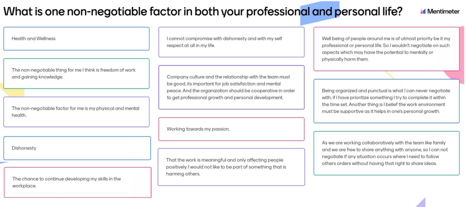 Many of the responses that came up were prioritising health and wellness, professional growth, personal development, upskilling, honesty and much more. It is evident what factors appeal to employees and what they look for in the workplace. There are specific factors that repeatedly appear in numerous workplaces when employees are indirectly asked to describe what they want from a workplace. These non-negotiables are important for employers to gain insight into how to meet the needs of their employees.